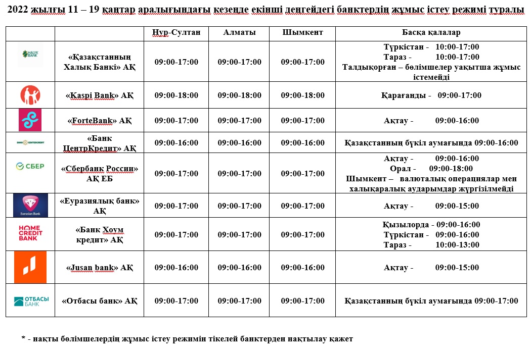 Екінші деңгейдегі банктердің нақты бөлімшелерінің жұмысы туралы толығырақ ақпаратты call-орталықтардан және мобильдік қосымшалардан нақтылау қажет.