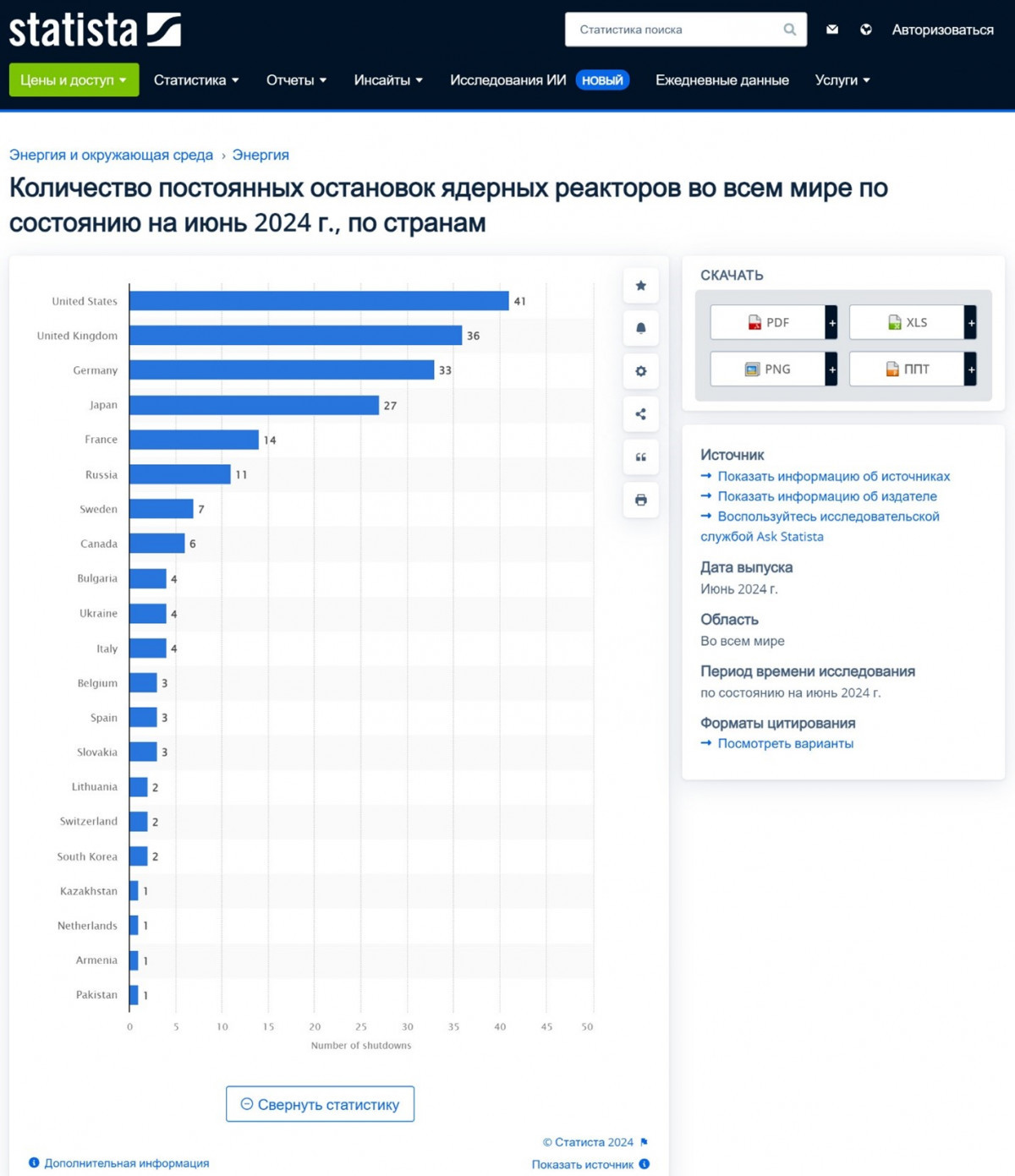 Тоқтатылған атом реакторларының саны. Сілтеме: https://www.statista.com/statistics/513639/number-of-permanent-nuclear-reactor-shutdowns-worldwide/#:~:text=As%20of%20June%202024%2C%20there,of%20shutdowns%2C%20with%2041%20units