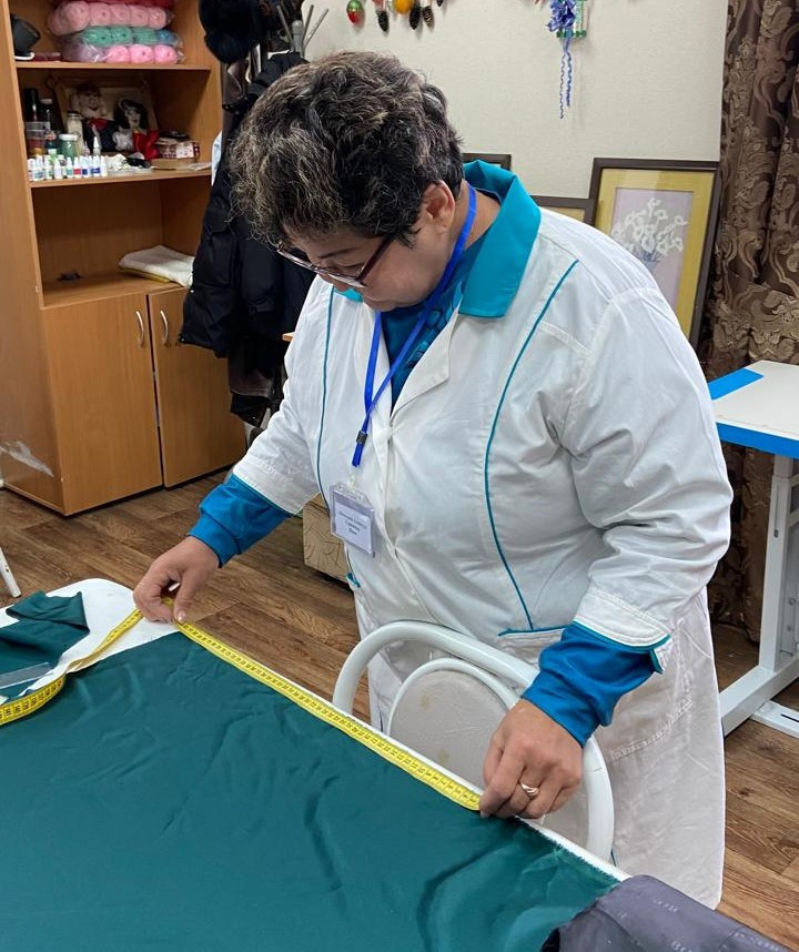 Ол кісі күні бойы осы қызметінде. Қызмет алушылардың киімінің етек-жеңін қысқартып, реттеп береді. Арасында шығармашылықпен айналысатын қарттардың концерттік бағдарламасына, қандай да бір сайысына қажетті киімдерді тігіп, дайындайтыны тағы бар.