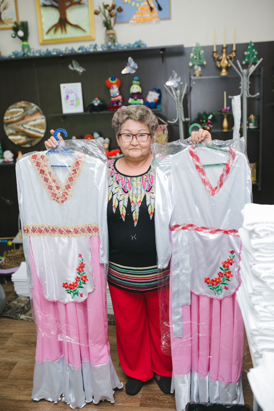 «Тігін тігіп жатқанымда қызметкерлердің біреуі жұмыста алаңдатса қарамаймын. Ал қызмет алушылардың біреуі келсе, істеп отырған жұмысымды тастап, соларды тыңдаймын. Кейде киімнің жеңін, етегін қысқарту секілді жеңіл жұмыстарды бірден істеп тастауды жөн көремін. Өйткені кейбір қарт кісілер күткенді ұнатпайды, не дұрыс түсінбейді. «Шамалы ғана жұмыс, соны істеп бере салса, несі кетеді?! Енді күтіп тұрамын ба?!» деп шығады. Сондықтан бірінші орында – қызмет алушылар» деген тігінші кейде орнынан тапжылмайтынын айтты. Қызмет алушының көркем шығармашылыққа қатысатындары аяқасты корей биін билейтін болып, таңға дейін бел жазбастан толыққанды үш киім тігіп берген.