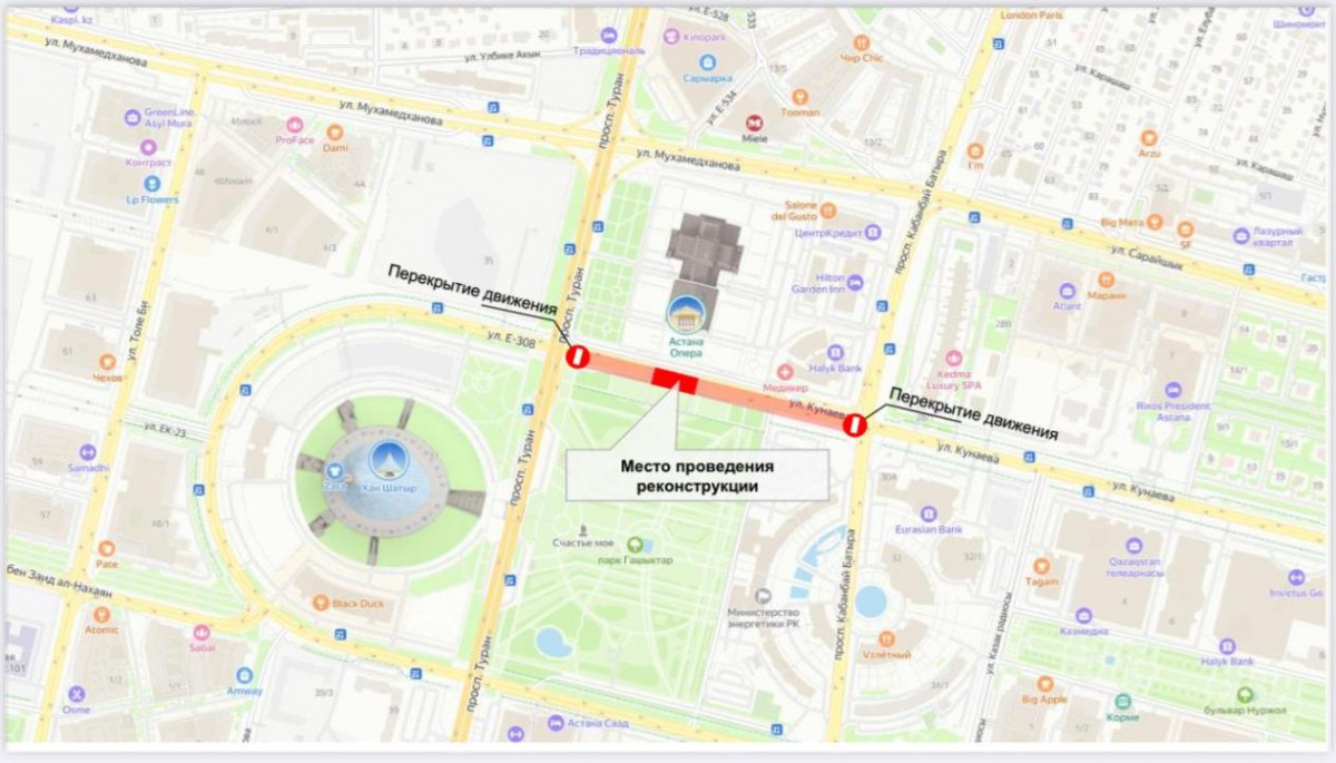 Осыған байланысты, Астана ПД әкімшілік Полиция басқармасының келісімі бойынша осы жылдың 19 ақпанынан 30 қазанына дейін Қонаев көшесінің Қабанбай батыр даңғылынан Тұран даңғылына дейінгі жол бөлігі жабылады. Бұл ретте автокөлік құралдарының қозғалысы іргелес Достық және Сарайшық көшелерімен қамтамасыз етілетін болады.