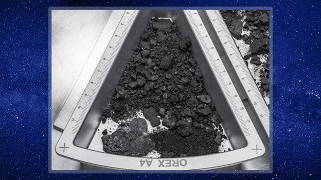 2023 жылы OSIRIS-REx миссиясы алып келген астероидтың беткі қабатының 120 грамм үлгісі. Фото llnl.gov сайтынан алынды. Авторлығы: NASA Johnson Space Center / Erika Blumenfeld and Joseph Aebersold)
