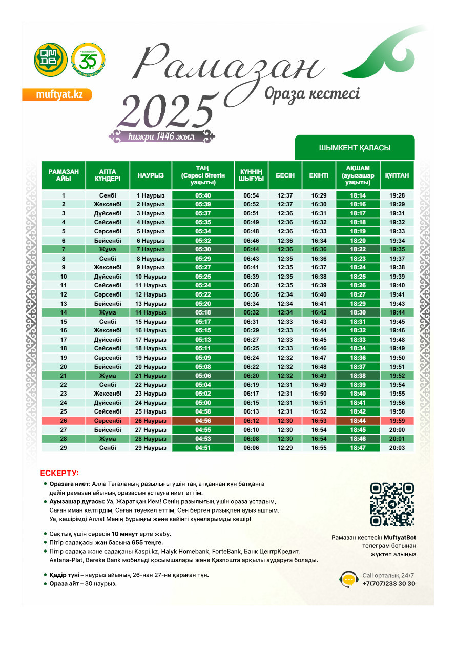 Сондай-ақ кез келген облыс, қала немесе ауылдың (барлығы 6000 елді мекен) ораза және намаз кестесін жоғары сапада PDF форматында muftyat.kz сайтынан жүктеп алуға болады.