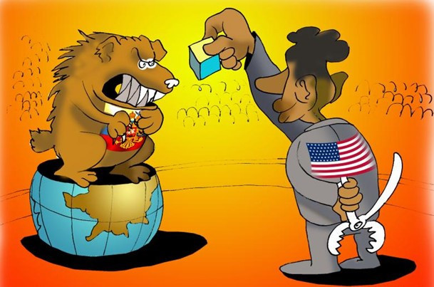 «Екі төбет таласса, ортасында қараша үйдің күшігі өледі» деген өмірден алынған мақал дәл айтылған сияқты. Карикатура cartoonmovement.com сайтынан алынды. Авторлығы: Sergei Fedko