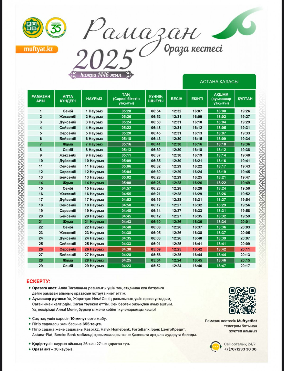 Ертең Рамазан айы басталады, осы орайда Aikyn.kz мүфтияттың оразаға қатысты мәліметі негізінде Астана қаласының ораза кестесі мен оразаның пайдасы туралы ақпарат жариялайды.