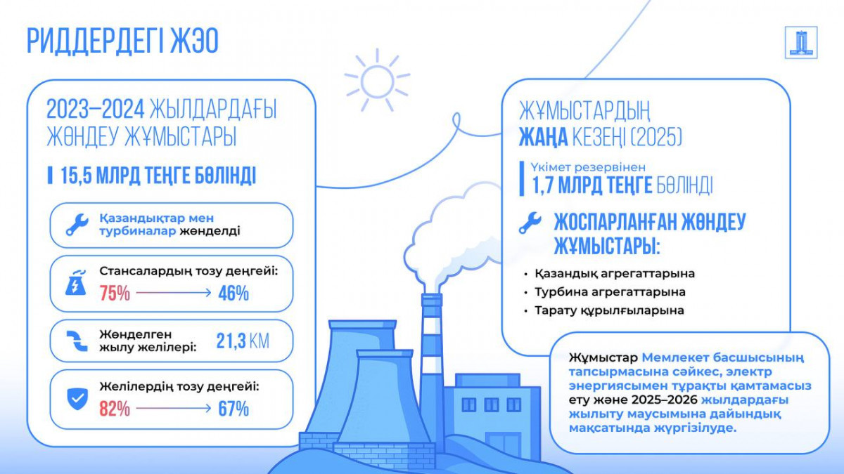 Осылайша, бөлінген қаражат Риддер қаласының жылу электр орталығын алдағы 2025-2026 жылыту маусымына уақытылы әрі сапалы дайындауды қамтамасыз етеді.