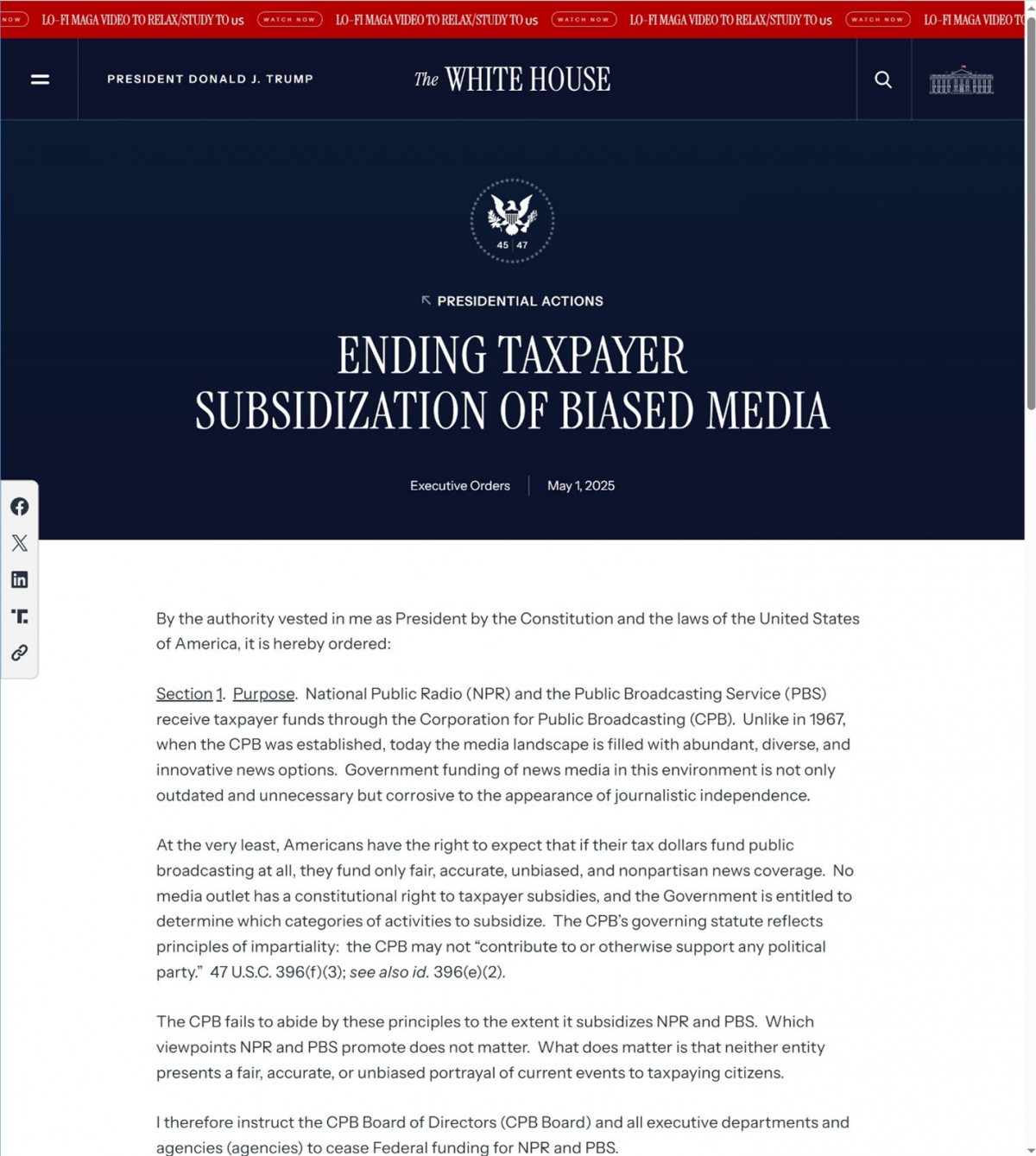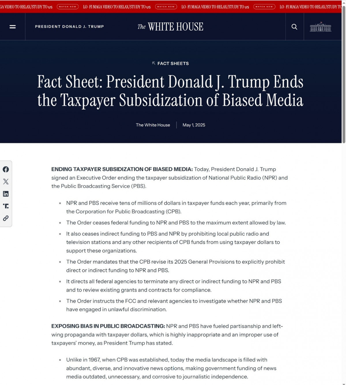 Елдегі ең ірі қоғамдық хабар тарату ұйымдарына (NPR мен PBS) берілетін федералдық қаржыны қысқарту туралы жарлыққа президенттің қол қойғаны бейсенбі күні (1 мамыр) кешкісін белгілі болды. Жарлықта бұл екі ұйым «біржақты көзқарас ұстанады» деп сипатталып, Қоғамдық хабар тарату корпорациясына (CPB) оларға тікелей қаржыландыруды тоқтату тапсырылған. Бұл шешім республикалық партия тарапынан дәстүрлі медианы сынға алу аясында қабылданып отыр.