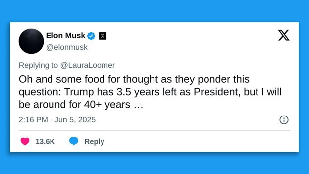 Илон Маск: «Трампқа 3,5 жыл қалды. Ал мен өз орнымда 40 жылдан аса боламын». Скриншот X әлеуметтік желісіндегі Илон Масктің ресми аккаунтынан алынды. Авторлығы: X / @elonmusk