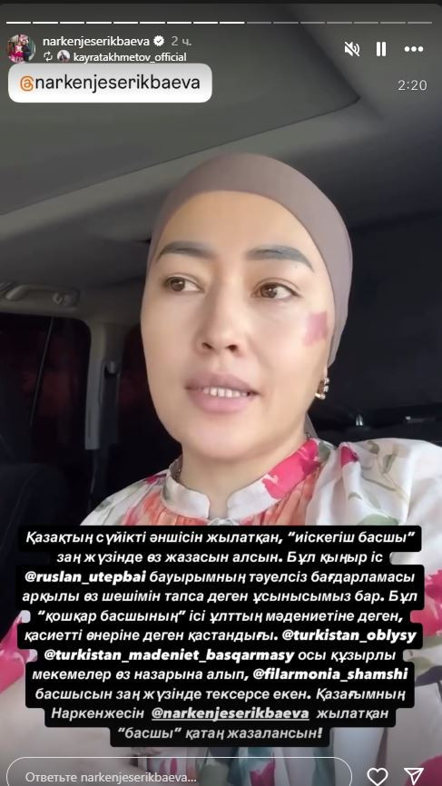 Танымал әнші Наркенже Серікбаева Шәмші Қалдаяқов атындағы Түркістан облыстық филармониясының басшысы өзіне қысым көрсеткенін айтты, – деп жазды Aikyn.kz.