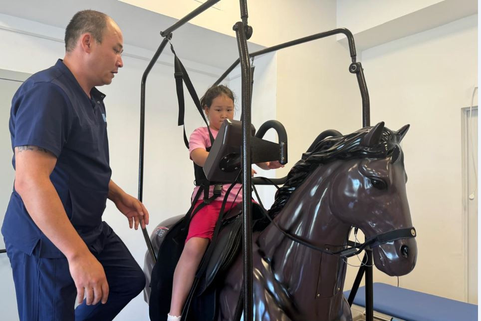 – Бұл иппотренажер деп аталады. Оңтүстік Кореяда құрастырылған. Осы аппаратты тоққа қосқанда ол кәдімгі шауып келе жатқан ат секілді жорғалайды. Дәл сол қимыл адамға пайдалы. Біз науқасты осы аттың үстіне отырғызып, құдды атқа шапқандай әсермен оңалту шарасын жүргіземіз. Жылдамдықты өзіміз басқарамыз. Күшейтеміз немесе азайтамыз. Атқа шапқанда адамның барлық бұлшық еті қозғалады. Қатаяды. Қимыл дұрысталады. Міне, бұл иппотренажер да солай. Тірек-қимылы бұзылған науқастардың бұлшық еттерін қатайту үшін осымен шапқызамыз. Солайша адамның мойын, бел бұлшық еттері қатаяды. Анау тұрған жылқының ері іспеттес аппарат. Ол ер адамдарды оңалтуға арналған, – деп атап өтті орталықтың маманды Алтынбек Нәбиев.