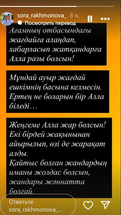 "Ағамның отбасындағы жағдайға алаңдап, хабарласып жатқандарға Алла разы болсын! Мұндай ауыр жағдай ешкімнің басына келмесін. Ертең не боларын бір Алла біледі... Жеңгеме Алла жар болсын! Екі бірдей жақынынан айырылып, өзі де жарақат алды. Қайтыс болған жандардың иманы жолдас болсын, жандары жәннатта болғай", – деді Сора Рахмонов.