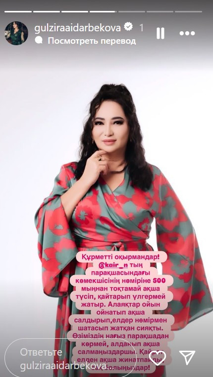 «Құрметті оқырмандар! Қайраттың парақшасындағы көмекшісінің нөміріне 500 мыңнан тоқтамай ақша түсіп жатыр, қайтарып үлгермей жатыр. Алаяқтар ойын ойнатып, ақша салдырып, елдер нөмірден шатасып жатқан сияқты. Өзіміздің нағыз парақшамыздан көрмей, алданып ақша салмаңыздаршы. Қайрат елден ақша жинатпайды, сақ болыңыздар!» - деп жазды Гүлзира Айдарбекова.