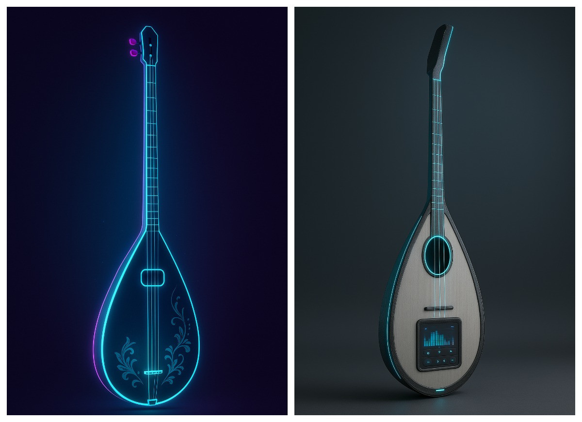 Сондай-ақ, болашақ домбыраға сандық технологиялар енуі мүмкін. Аспаптың ішіне микрофон, дыбыс өңдейтін чип, Bluetooth сияқты құрылғылар орнатылып, ол өздігінен дыбысты жазып, реттеп, тіпті оқыту функциясын атқаруы да ықтимал. Жинамалы немесе ерекше пішінді домбыралар пайда болып, алып жүруге де ыңғайлы болмақ. Осы болжаулар негізінде біз жасанды интеллектке болашақ домбыра қандай болуы мүмкін екенін сурет салып беруін сұрадық