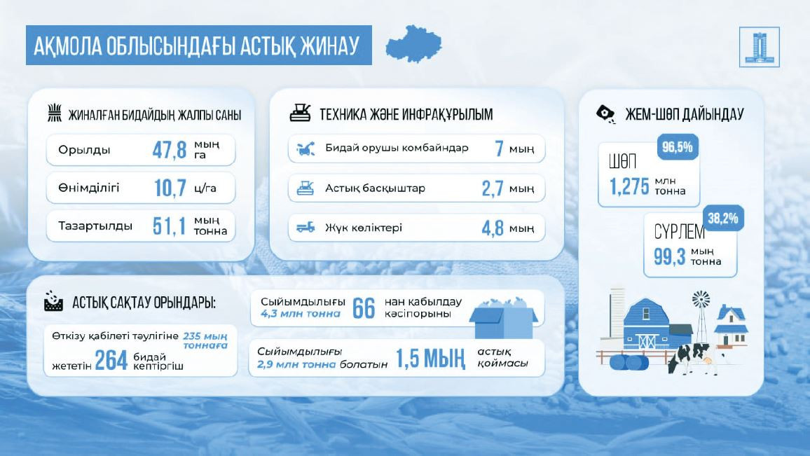 Жаңа егінді сақтау мәселесіне де айрықша көңіл бөлінгенін атап кеткен жөн. Ақмолада жалпы сыйымдылығы 4,3 млн тонна болатын 66 лицензияланған астық қабылдау кәсіпорны және 2,9 млн тонна сыйымдылықтағы 1,5 мыңнан астам қойма жұмыс істеп келеді. Сағатына 9,7 мың тонна кептіретін 264 астық кептіргіші іске қосылып, тәулігіне 235 мың тонна астық кептіруге мүмкіндік береді.