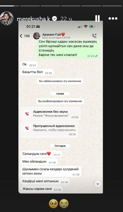 "Сағындым сені. Мен ойландым. Шынымен соңғы кездері қолдамай кеткен екем. Кешірші мені, алтыным. Жақсы көремін сені", - деп жазған Арсен.