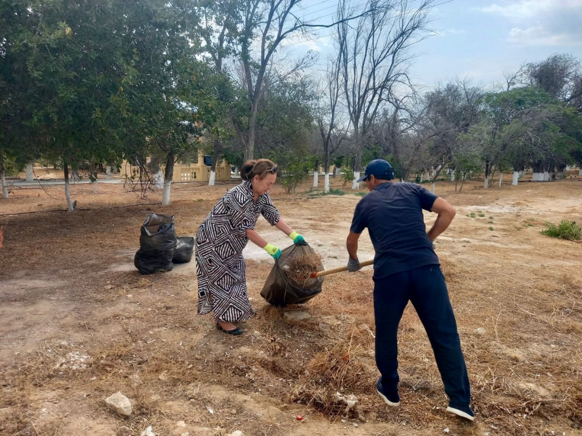 Атырау облысы Махамбет ауданында тұрғындар аудандық мәслихат депутаты, «AMANAT» партиясы фракциясының мүшесі Эльмира Еспусиновамен бірге орталық саябақты тазалады. Олар құрғақ шөп пен жапырақты, қоқыс салынған қаптарды жинап, демалыс аумағын ретке келтірді.