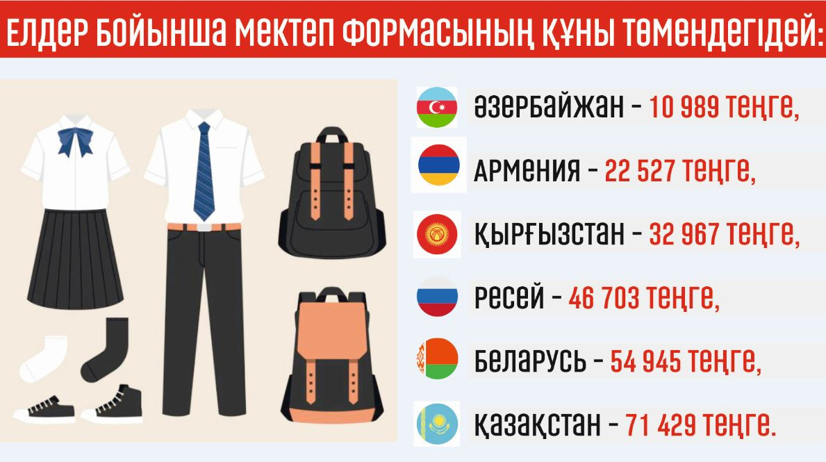 – Жыл сайын бір оқушыны мектепке дайындау үшін ата-аналар біршама шығындалады. Статистика бойынша, ТМД елдері арасында ең қымбат мектеп формасы Қазақстанда екені анықталды (71 429 теңге). Ал ең арзан мектеп формасы Әзербайжанда тіркелген. Орта есеппен шығын – 10 989 теңге. Кейбір мектеп формасын міндеттеген елдер оның бағасын төмендету саясатын ұсынады. Біздің елге де осындай бастама қажет пе?