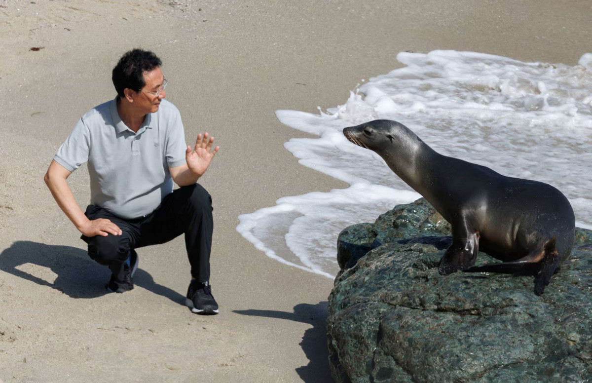 Ер адам 3 қыркүйек күні Калифорния штатының Сан-Диего қаласындағы Ла-Хойя жағалауында теңіз арыстанына жақындап келеді REUTERS/Mike Blake
