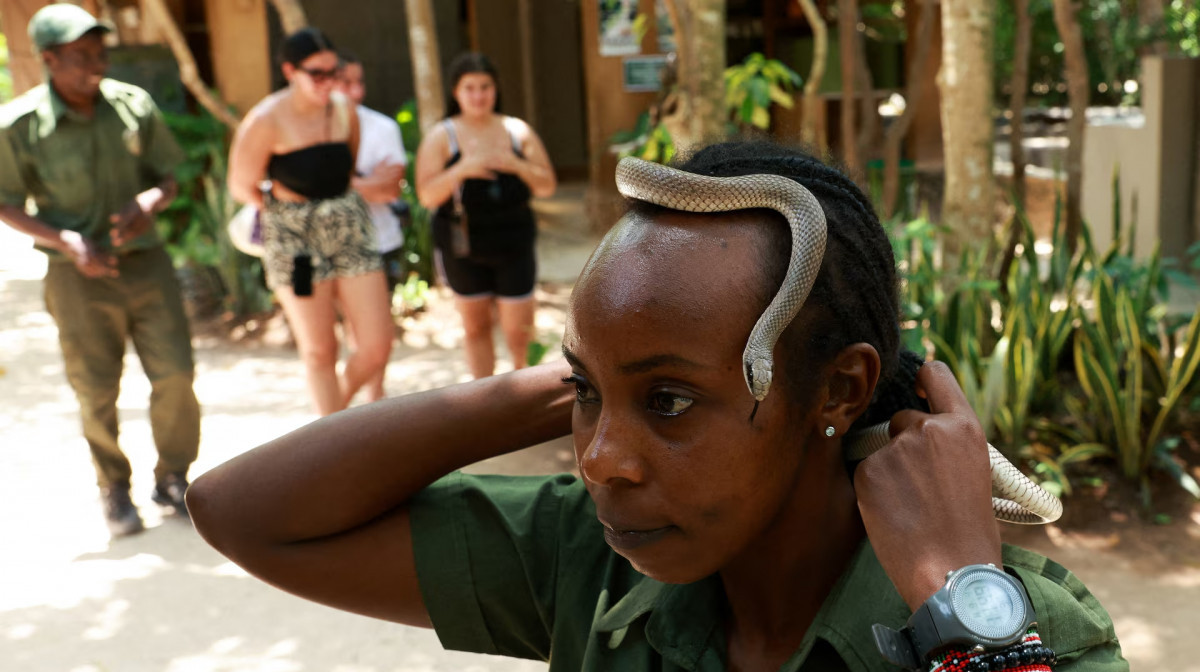 Жылан үйретуші Мэри Мамби 4 қыркүйек күні Кенияның Килифи округіндегі Малинди қаласындағы Ватаму жылан фермасында өзінің сүйікті жыланы — қызылтұмсық сұр жыланмен тілдесіп тұр.