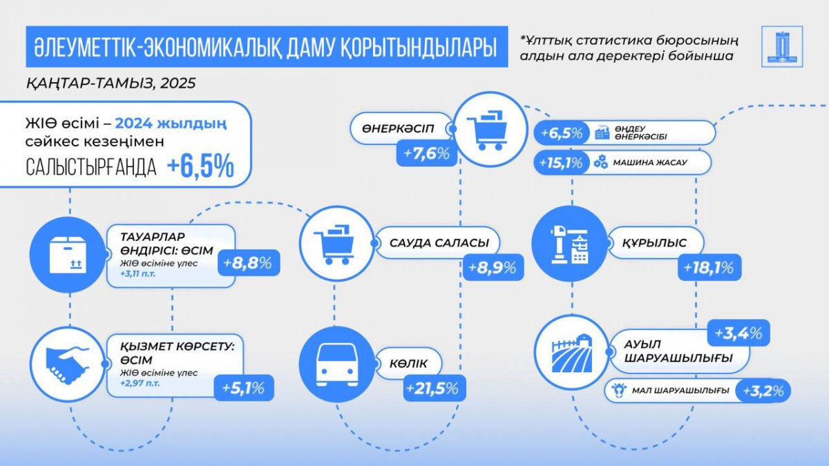 Ұлттық статистика бюросының жедел деректері бойынша, 2025 жылдың сегіз айында Қазақстанның ЖІӨ өсімі 6,5%-ды құрады, – деп хабарлайды Aikyn.kz сайты.