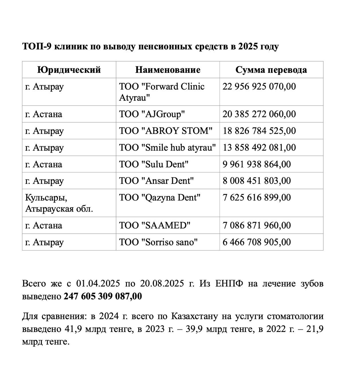 Еске салайық, Қазақстанда Бірыңғай жинақтаушы зейнетақы қорынан (БЖЗҚ) зейнетақы қаражатын заңсыз шешіп алудың ауқымды схемасы әшкереленді. Прокуратура органдары мен Қаржылық мониторинг агенттігінің бірлескен жұмысы барысында Атырау облысында бес қылмыстық топ анықталып, олар қаражатты жалған стоматологиялық клиникалар арқылы шығарғаны белгілі болды.