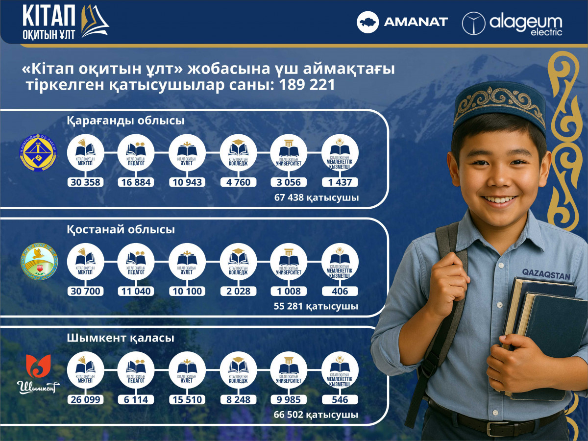 Қарағанды облысы бойынша 67 438 қатысушы тіркелсе, Қостанай облысы бойынша 55 281 азамат өтінім берген. Ал Шымкент қаласынан 66 502 өтінім келіп түсті.