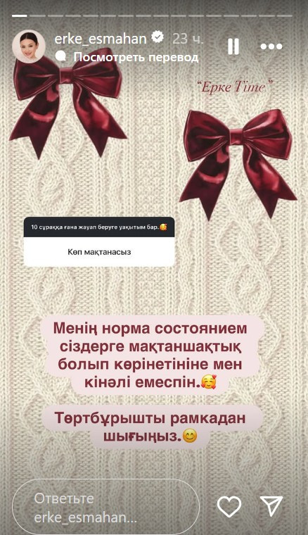 Әнші Ерке Есмахан желіде оқырмандарының сұрақтарына жауап берді, – деп жазды Aikyn.kz.