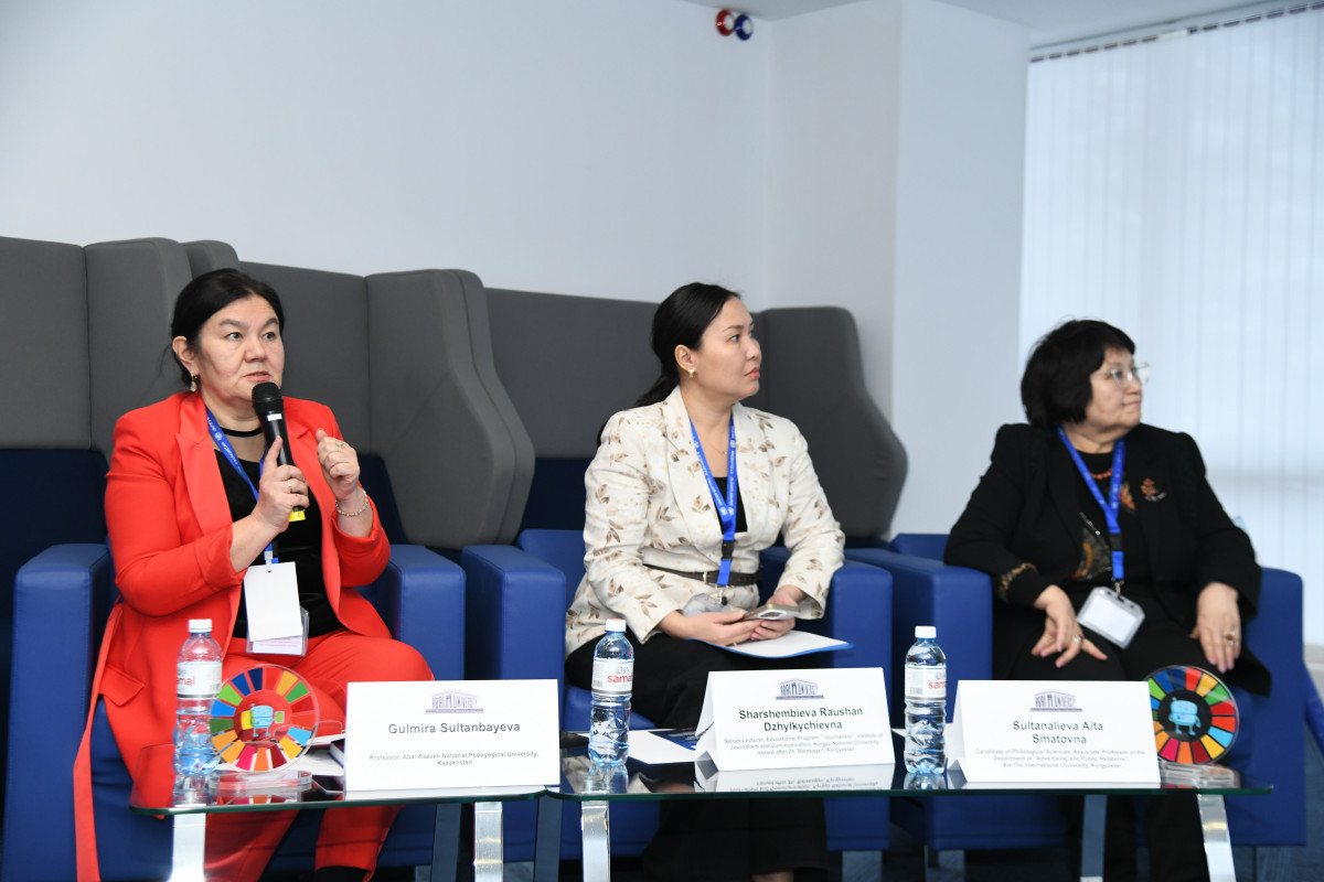 Профессор Клара Қабылғазина ҚазҰУ-дың журналистика факультетінде фактчекингті оқытудың авторлық әдістемесінің тәжірибесі мен болашағын қорытындылады. «Ала-Тоо» Халықаралық университетінің Әлеуметтік ғылымдар факультетінің «Жарнама және қоғаммен байланыс» кафедрасының меңгерушісі Айнұра Қабатай қызы «Жалған контенттің просодиялық маркерлері: манипуляциялық және жалған хабарламаларды анықтау үшін аудиоталдау мүмкіндіктері» атты қызықты әрі пайдалы баяндама жасады.