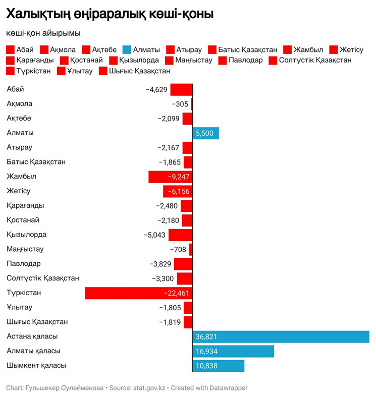 Өңіраралық көші-қон балансында Түркістан облысынан бір жылда 22 мыңнан астам адам көшіп кеткен. Жамбыл мен Жетісу облыстарында да халық саны азаюда. Ал негізгі қабылдаушы өңірлер – Астана, Алматы және Шымкент. Астанаға жыл сайын 35 мыңнан астам жаңа тұрғын келеді.