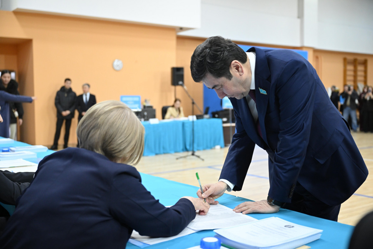 Мәжіліс Спикері өз дауысын «Қазақстан темір жолы» ұлттық компаниясының ғимаратында орналасқан №128 учаскесінде берді.