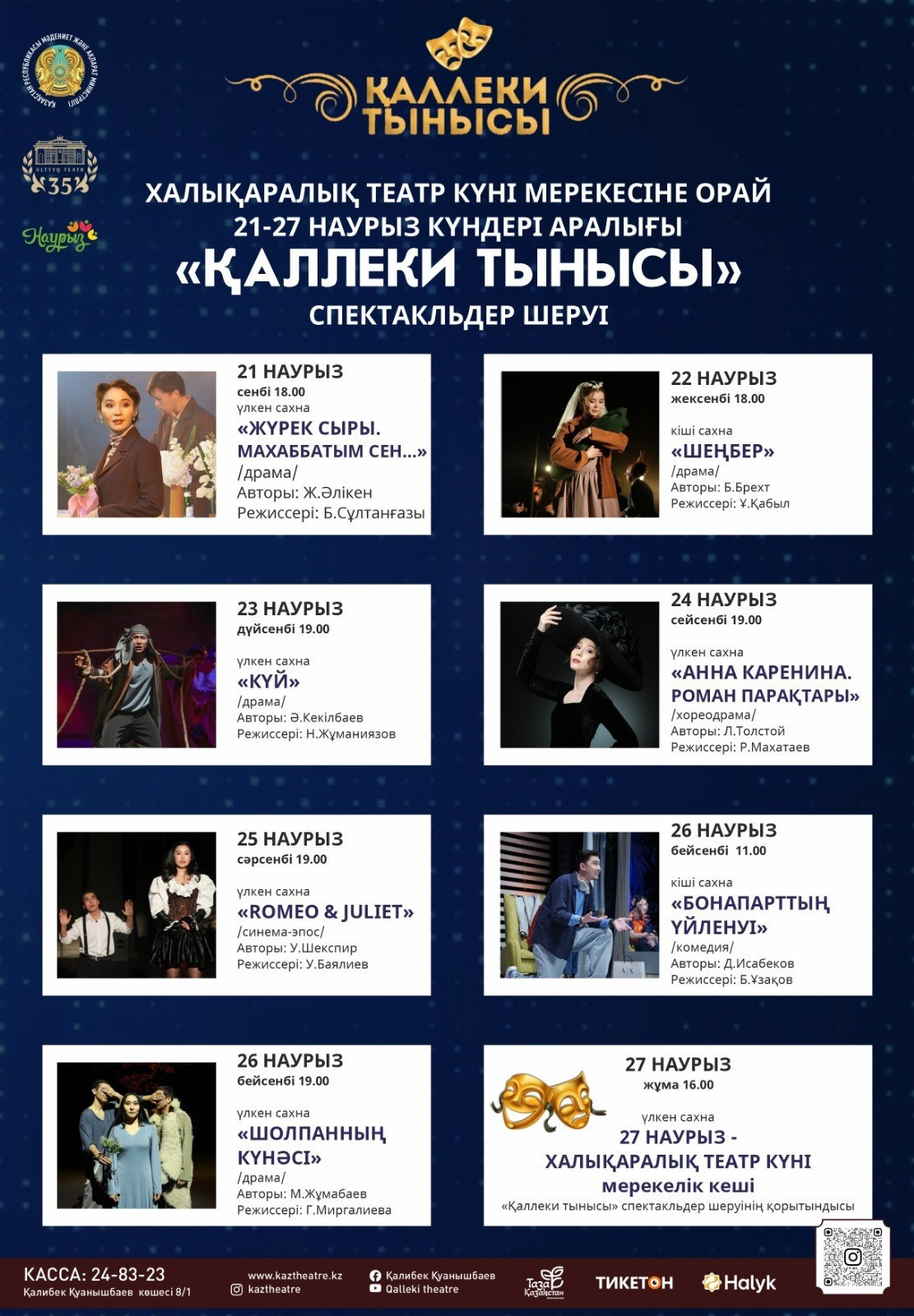 Қалибек Қуанышбаев атындағы Қазақ ұлттық музыкалық драма театры «27 наурыз - Халықаралық театр күні» мерекесіне орай, 21-27 наурыз күндері аралығында дәстүрлі «Қаллеки тынысы» атты спектакльдер шеруін ұсынады, - деп хабарлайды Aikyn.kz.