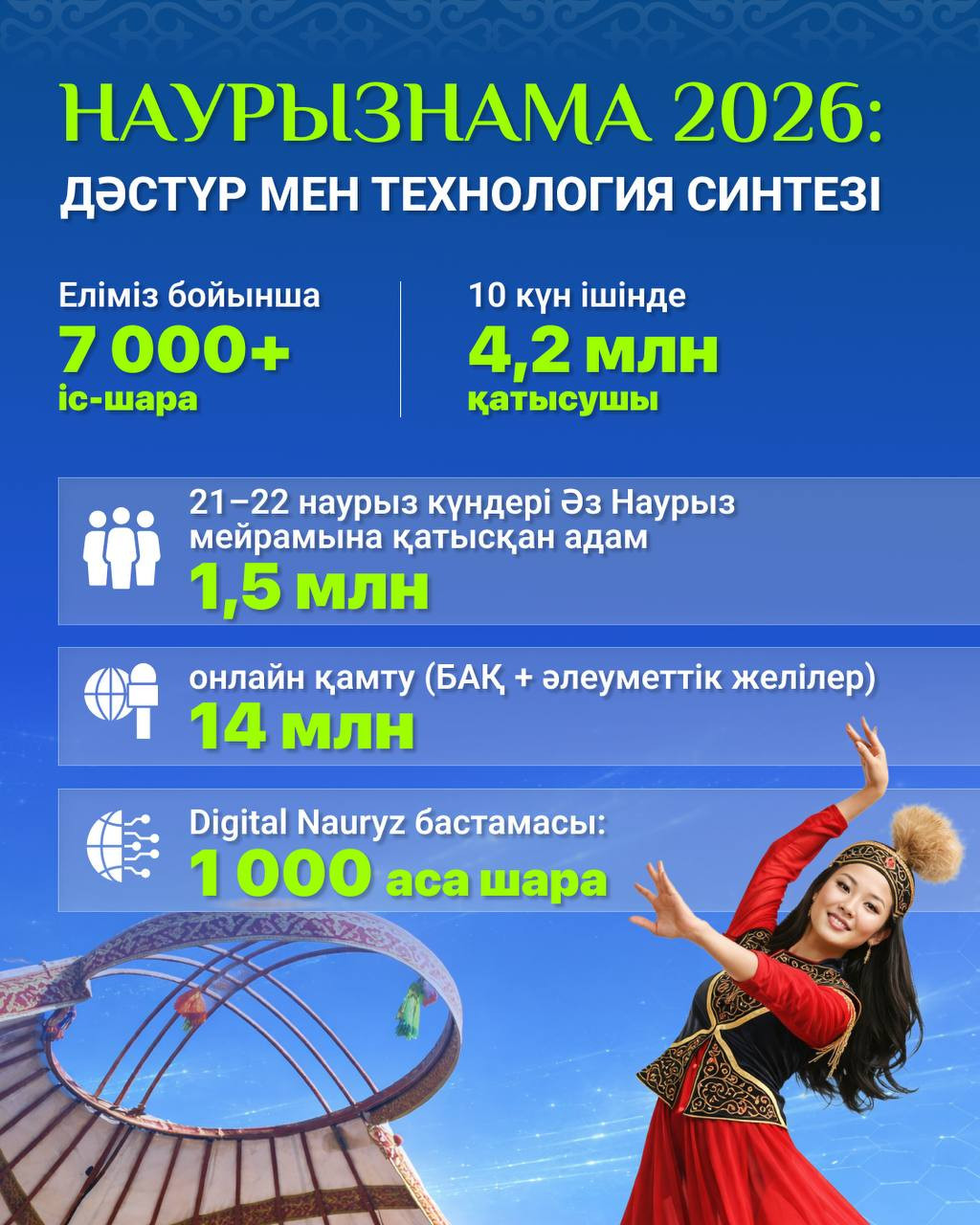 Наурызнама аясында еліміз бойынша 7 мыңнан астам іс-шара өтті, олар барлық өңірлерді қамтыды. 10 күндік мерекеге жалпы 4,2 млн адам қатысса, оның ішінде негізгі күндері — 21–22 наурызда — шамамен 1,5 млн адам қамтылды. Сонымен қатар, БАҚ пен әлеуметтік желілердегі жарияланымдар арқылы жалпы онлайн қамту 14 млн желі пайдаланушыны қамтыды.