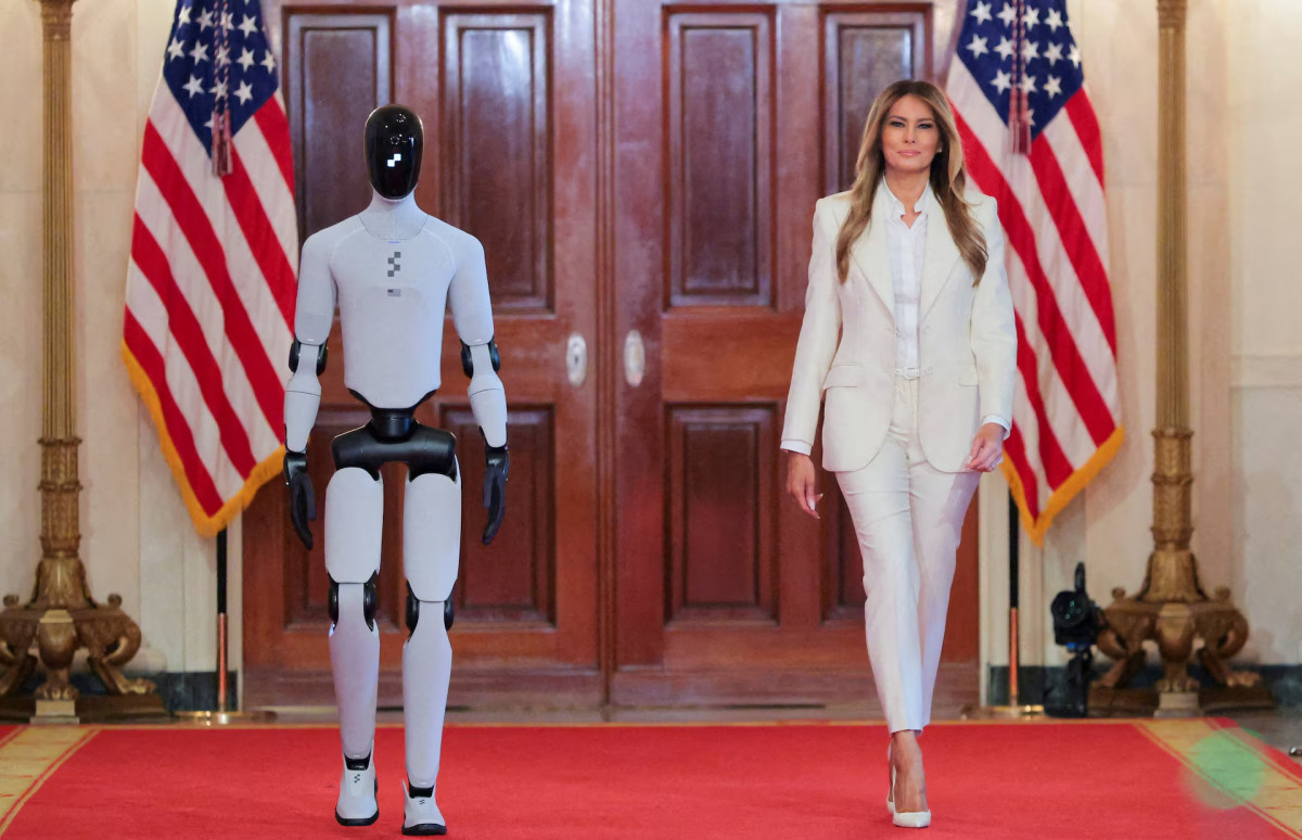 АҚШ-тың бірінші ханымы Мелания Трамп 25 наурыз күні Ақ үйде өткен дөңгелек үстел барысында адамға ұқсас роботтың жанында келе жатыр. REUTERS/Kylie Cooper.