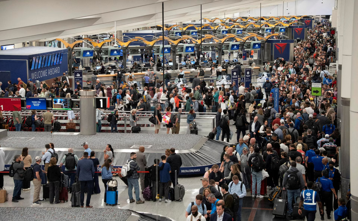 Иммиграция және кеден қызметінің жүздеген қызметкері TSA кадр тапшылығын толықтыру үшін әуежайларға жіберілгеннен кейін жолаушылар TSA бақылау бекетіне қарай ұзын кезекте тұр. Сурет 23 наурыз күні Джорджия штатындағы Атланта қаласындағы Хартсфилд–Джексон халықаралық әуежайында түсірілген. REUTERS/Alyssa Pointer.