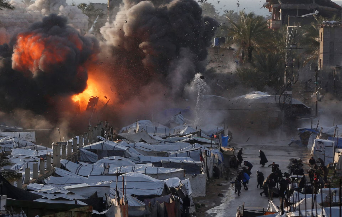 25 наурыз күні Газа секторының орталық бөлігіндегі Дейр-эль-Балахта қоныс аударған палестиналықтар орналастырылған шатырлы лагерьге жасалған Израиль соққысынан кейін түтін мен жалын көтеріледі. REUTERS/Stringer.