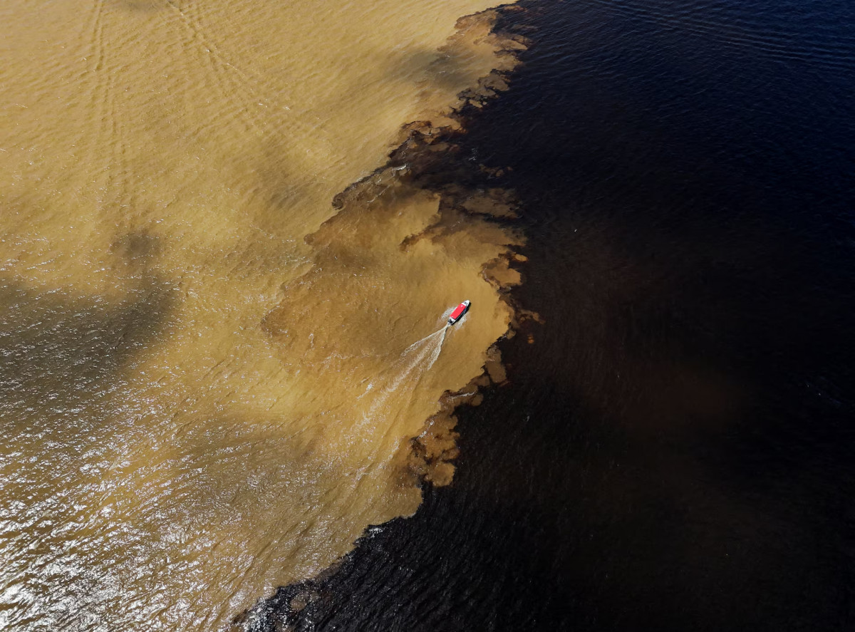 22 наурыз күні Бразилияның Амазонас штатындағы Манаус маңында Дүниежүзілік су күніне арналған символикалық шеру кезінде «Су форумы» ұйымының мүшелері отырған қайық Рио-Негро мен Солимоэс өзендерінің түйіскен жерінен өтіп барады. REUTERS/Bruno Kelly.