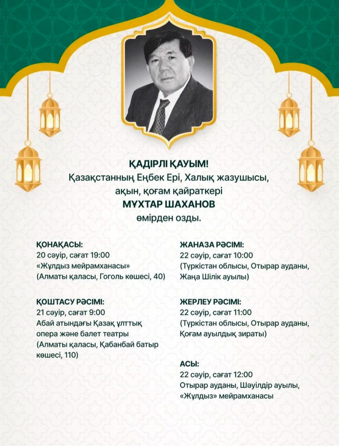 «Әлемге әйгілі қазақтың ұлы ақыны, Тұран тұлғасы, Қазақстанның Еңбек Ері, Қазақстанның Халық жазушысы Мұқтар Шаханұлының ақырғы аманаты орындалатын болды құдай қаласа. Ақын ата-бабасы жатқан киелі Отырар өңіріндегі қасиетті Арыстан бап кесенесі маңына жерленеді. Марқұмды шығарып салу рәсімі ертең 21 сәуірде Алматы қаласындағы Абай атындағы опера және балет театрында сағат 9.00-де өтеді. Содан соң ақынды туған жері киелі Отырар ауданына алып кетіп, 22 сәуірде Арыстан баб кесенесінің маңындағы зиратқа қойылады. Пейіште рухы шалқи бергей!» - деді депутат.