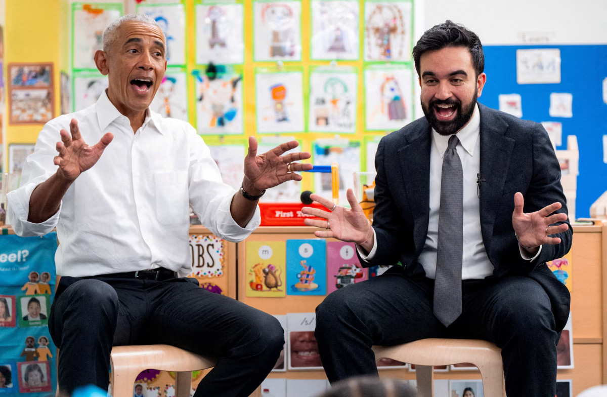 АҚШ-тың бұрынғы президенті Барак Обама мен Нью-Йорк мэрі Зоран Мамдани Нью-Йорктегі Learning Through Play Pre-K балабақшасында бірлескен оқу барысында «Автобустағы дөңгелектер» әнін орындап жатыр, 18 сәуір. Фото: Анджелина Кацанис/Pool