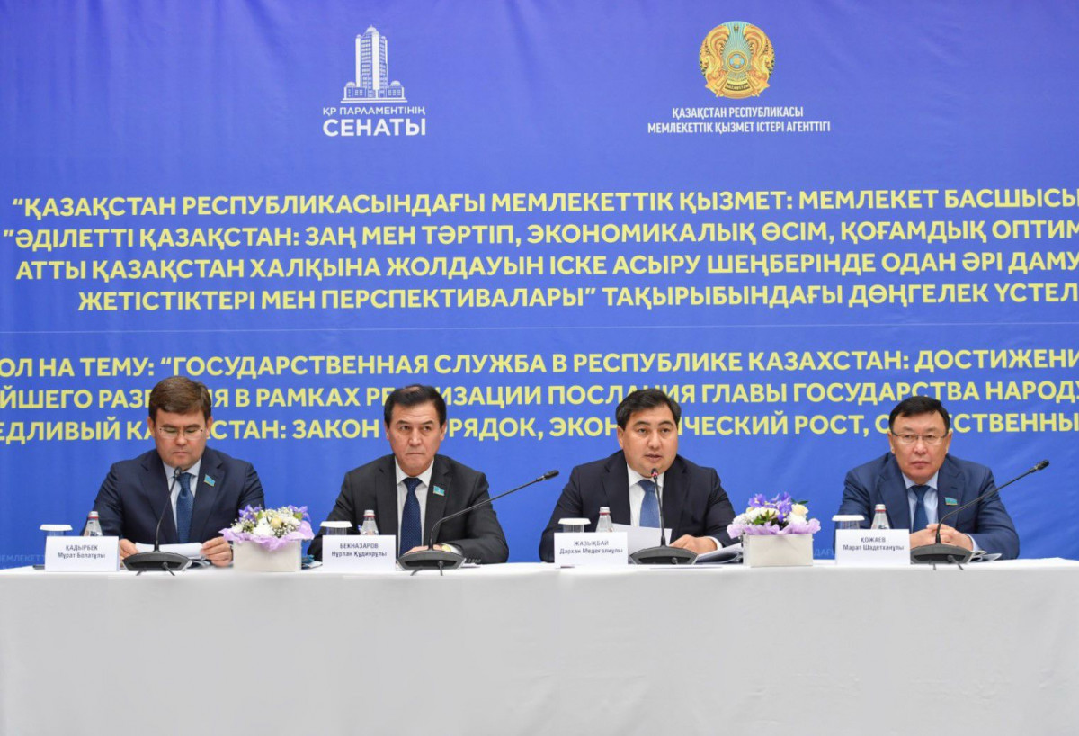 Бүгін Мемлекеттік қызмет істері агенттігінде ҚР Парламенті Сенатының Конституциялық заңнама, сот жүйесі және құқық қорғау органдары комитетінің ұйымдастыруымен «Мемлекет басшысының «Әділетті Қазақстан: заң мен тәртіп, экономикалық өсім, қоғамдық оптимизм» атты Қазақстан халқына Жолдауын іске асыру аясында «Қазақстан Республикасындағы мемлекеттік қызмет: жетістіктері мен перспективалары» тақырыбында дөңгелек үстел өтті.