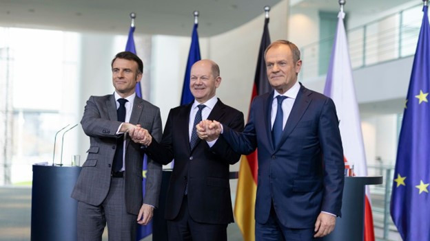 Польша мен Франция Германияның қайта қарулануынан тыжырынып кетеді. Эммануэль Макрон, Олаф Шольц және Дональд Туск Берлиндегі келіссөздерде. Фото economist.com сайтынан алынды. Авторлығы: Picture Alliance