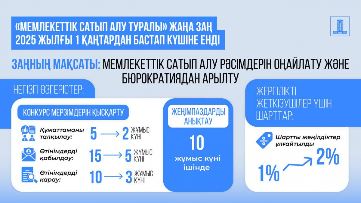 Қазақстанда 2025 жылғы 1 қаңтардан бастап күшіне енген жаңа жеңілдетілген ережелер бойынша мемлекеттік сатып алу туралы алғашқы шарттар жасалды. Оларды қабылдау жобаларды, соның ішінде әлеуметтік маңызы бар жобаларды жедел іске қосуға және олардың қымбаттауындағы тәуекелдерді азайтуға мүмкіндік береді. Жеңімпаздар негізінен жергілікті компаниялар болады, бұл аймақтардың бизнесі мен экономикасына қолдау көрсету болып саналады, – деп хабарлайды Aikyn.kz.