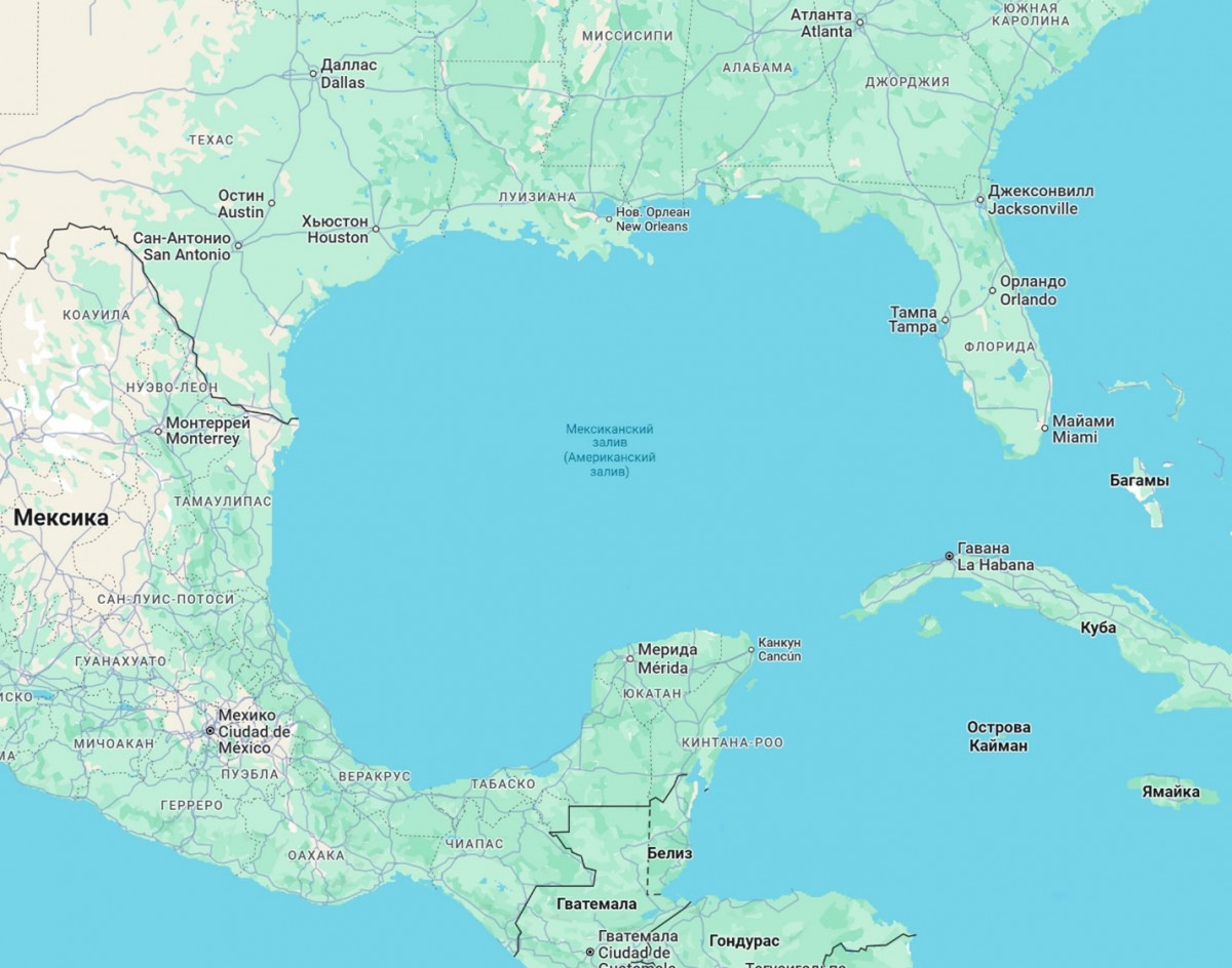 АҚШ-та Мексика шығанағының атауын Америка шығанағы, әлемнің басқа аймақтарында екі атау, Мексикада тек Мексика шығанағы деп жазылған. Скриншот Google Maps платформасынан алынған