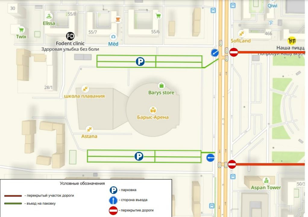 - футбол матчының көрермендері үшін қозғалыс тек Қабанбай батыр даңғылы арқылы жүзеге асырылады;