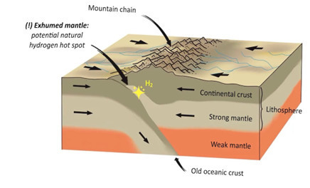 Таулар – сутегі газы орналасқан «ыстық нүктелері» болуы мүмкін. Тектоникалық плиталар қақтығысып, таулар түзілген кезде, мантияның терең қабаттарынан шыққан жыныстар жер бетіне көтеріледі. «Ыстық нүктелер» – сутегі газына бай аймақтар осы жыныстардың бетке шығатын жерлерінде, таулардың астында орналасуы мүмкін.