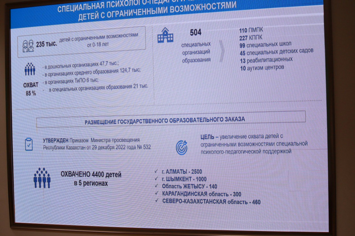 Сонымен, қоғамдық кеңесте мәлім болғандай, биыл жыл басында ел бойынша 18 жасқа дейінгі ерекше білім беру қажеттіліктері бар (бұдан әрі – ЕБҚ) 235 мыңнан астам бала есепке алынған. Инклюзивті білім беруді дамыту бойынша мақсатты көрсеткіштер 2023-2029 жылдарға арналған Білім беруді дамыту тұжырымдамасында және 2025-2030 жылдарға арналған Инклюзивтік саясат тұжырымдамасында көрсетілген.