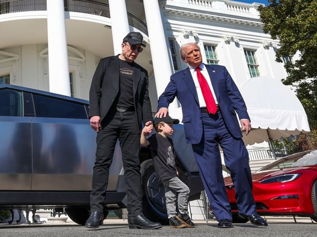 Президент Дональд Трамп Илон Маск және оның 4 жасар ұлымен бірге Ақ үйдің алдында көлік таңдап жүр. Фото news.sky.com сайтынан алынды