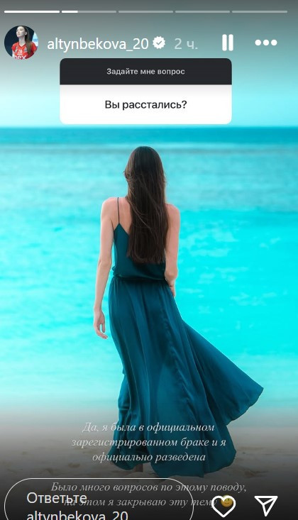 Спортшы әлеуметтік желіде оқырманның сұрағына жауап беріп, кәсіпкер Саят Салманұлымен ажырасқанын растады.