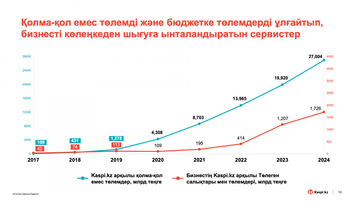 2024 жылы 7,5 миллион адам Kaspi.kz арқылы салық төледі. Сервис арқылы жеке тұлғалар мен жеке кәсіпкерлер төлеген салық көлемі жыл ішінде шамамен 2,2 трлн теңгені құрады. Бұл 2023 жылмен салыстырғанда 34%-ға көп.