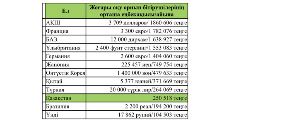 Талдаушылардың зерттеулеріне сәйкес, ең үлкен еңбекақыны – АҚШ, Франция және БАЭ жас мамандары алады. Мысалы, АҚШ жоғары оқу орнын бітіруші, еңбек тәжірибесі аз болғанда да, орташа алғанда, айына 3 709 доллар алады (шамамен 1,86 млн теңге), Францияда – 3 300 евро (1,78 млн теңге), ал БАЭ – 12 000 дирхам (1,64 млн теңгеге) дейін. Ұлыбритания және Германияда – шамамен 1,4-1,5 млн теңге.
