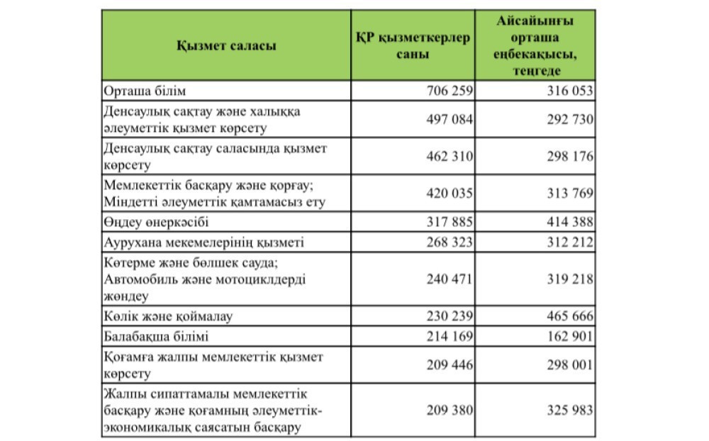 Осыған орай, ең жоғары еңбекақысы келесі салалар бойынша бекітілген, атап айтқанда: қаржы қызметі және сақтандыру – айына 1 млн теңгеге дейін, сондай-ақ компьютерлік бағдарламалау, су, теңіз, әуе, құбырлар жеткізу көлігінің қызметі – айына 800 мың теңгеден астам.